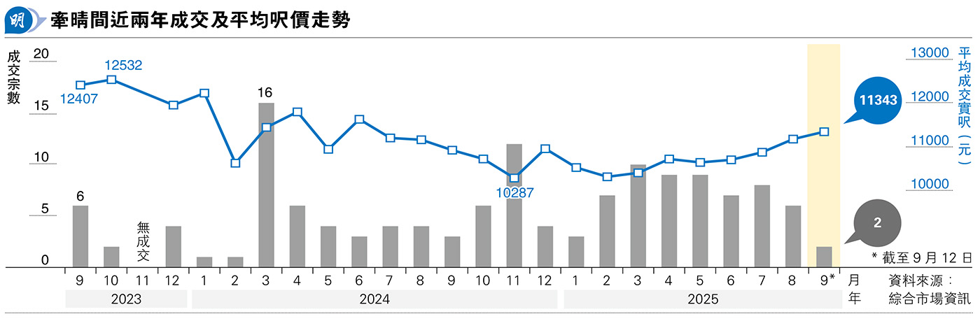 【明報專訊】近期港股做好,加上市場憧憬本月美國大有機會重啟減息,以及特首《施政報告》將有利好樓市新措施出台,不少上車客趁機搶閘入市;其中9月至12日為止暫錄約兩宗二手成交的粉嶺牽晴間,錄得年輕上車客入市。有代理預期,待本月美國落實減息,將帶動入市氣氛,成交量有機會倍增。
