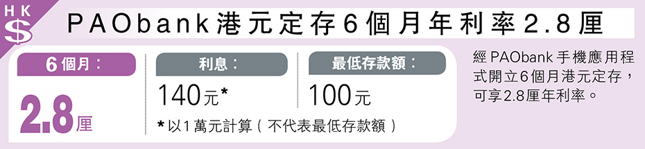 經濟 PAObank港元定存6個月年利率2.8厘 發佈於 4 個月 前 2025 年 9 月 16 日 By 明報 【明報專訊】經PAObank手機應用程式開立6個月港元定存,可享2.8厘年利率。(圖) 日報新聞-相關報道: 南商3個月美元定存年利率4厘 (2025-09-16) 相關文章:南商3個月美元定存年利率4厘 (2025-09-16) Up Next 南商3個月美元定存年利率4厘 不要錯過 張兆聰:快手易獲資金青睞博突破 繼續閱讀 贊助商 猜你喜歡