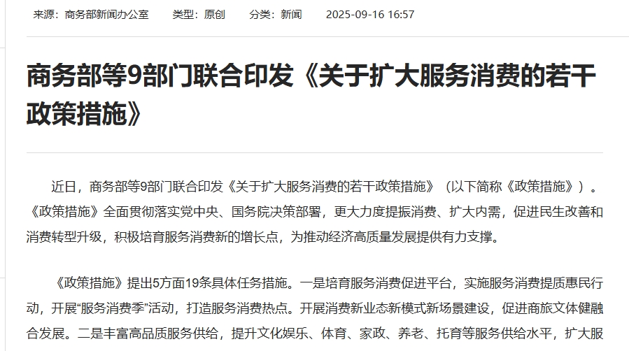 中國商務部網站9月16日發布,商務部等9部門近日聯合印發《關於擴大服務消費的若干政策措施》(下稱《政策措施》),提出5方面19條具體任務措施,提到要吸引更多境外人員入境消費,擴展數字服務消費。