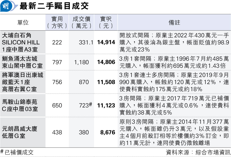 部分已補價居屋亦錄二手蝕使費個案。中原地產資深區域營業經理胡耀祖表示,馬鞍山錦泰苑C座中層03室,實用面積650方呎3房間隔,原業主叫價約730萬元,議價後減價7萬元或約1%,獲買家以723萬元已補價入市自用,實呎11,123元。原業主2017年719萬元已補價購入,持貨約8年,帳面雖獲利4萬元或0.6%,惟連使費料實蝕約38萬元或5%。