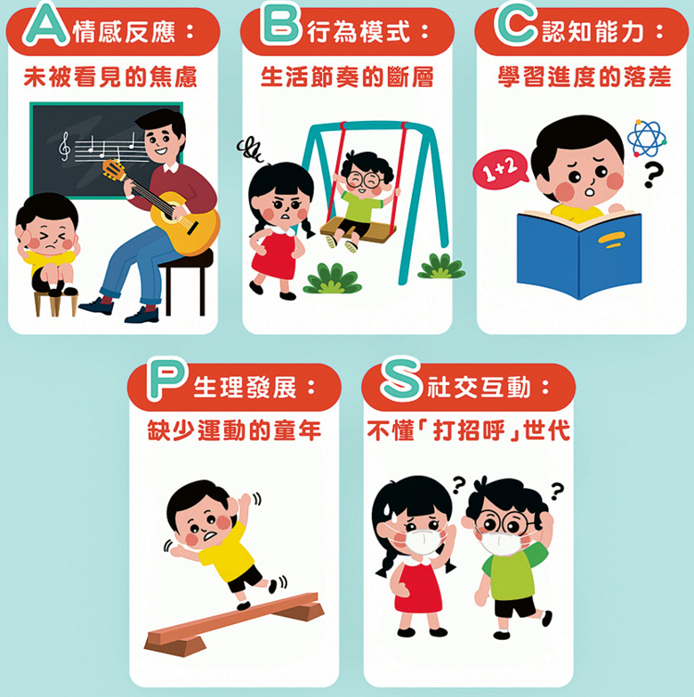 疫情的封鎖雖然早已過去,然而根據英國廣播公司報道,多份國際研究指出,這場全球災難對孩子身心發展的不同層面有深遠影響。數年「封鎖」令一代孩子失去大量的刺激與鍛煉機會,造成腦部和身體發展改變。從A、B、C、P、S的5個面向(情感Affective、行為Behavioural、認知Cognitive、生理Physiological及社交Social),我們可以更立體地理解疫後一代的「追落後」現象。