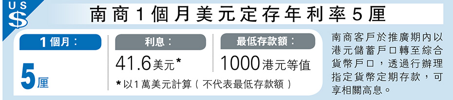 經濟 南商1個月美元定存年利率5厘 發佈於 4 個月 前 2025 年 9 月 24 日 By 明報 【明報專訊】南商客戶於推廣期內以港元儲蓄戶口轉至綜合貨幣戶口,透過行辦理指定貨幣定期存款,可享相關高息。(圖) 日報新聞-相關報道: 建行亞洲1個月港元定存年利率12厘 (2025-09-24) 相關文章:建行亞洲1個月港元定存年利率12厘 (2025-09-24) Up Next 姜靜:紐元兌美元或續偏弱整固 不要錯過 建行亞洲1個月港元定存年利率12厘 繼續閱讀 贊助商 猜你喜歡
