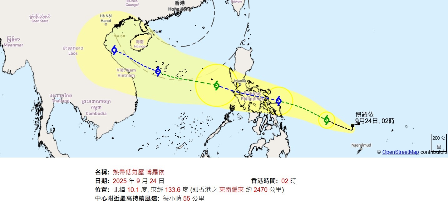 即時熱點 熱帶低氣壓博羅依生成 料靠近菲律賓東部沿海 (09:12) 發佈於 2 個月 前 2025 年 9 月 24 日 By 明報 熱帶低氣壓博羅依生成。內地中央氣象台表示,屬今年「第20號颱風」的博羅依於今晨(24日)5時在菲律賓以東洋面生成,其中心位於菲律賓馬尼拉東偏南方向約1420公里的西北太平洋洋面上;預計博羅依將以每小時10至15公里的速度向偏西方向移動,逐漸向菲律賓東部沿海靠近,於27日進入南海東部海域,之後向西北方向移動,強度有所增強。 相關文章:博羅依天氣速遞熱帶低氣壓編輯推介 Up Next 短片:颱風過後港島東海濱多塌樹 無阻市民運動 (14:14) 不要錯過 短片:三號風球杏花邨大浪 市民圍觀 (15:09) 繼續閱讀 贊助商 猜你喜歡 天氣|天文台:非常乾燥 日間最高22°C (08:47) 天氣|天文台:非常乾燥最高23°C 明早市區降至約15°C (08:24) 天氣|天文台:周四天晴非常乾燥 市區最低17°C (21:11) 天氣|天文台:本港今早較昨日低兩至三度 日間非常乾燥 (08:23) 天氣|天文台:周三天晴非常乾燥 早上清涼市區最低17°C (20:58) 天氣|天文台:最高25°C 本周持續天晴乾燥 (08:20)