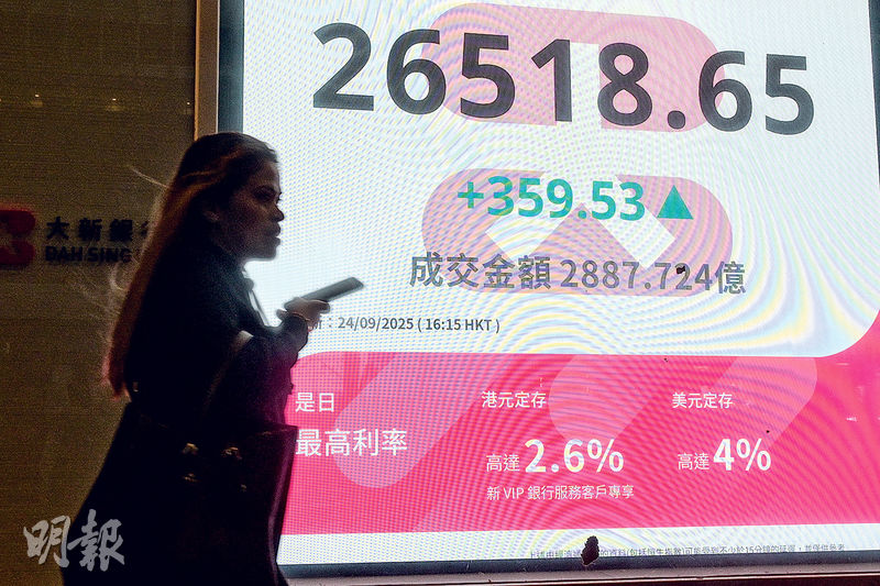 【明報專訊】「打風不停市」實施以來,本港股市昨首度迎來10號風球照炒股,亦是連續兩個交易日「打風不停市」。上有颱風下有炒風,方舟投資行政總裁Cathie Wood(木頭姐)相隔4年再披露購入阿里巴巴(9988),加上阿里指投資AI勢加碼(見另文),刺激阿里大升9%再創4年高位兼錄超過400億元成交,拉動港股重拾動力向上,恒指全日升359點,收報26,518點,重上10天線,成交2887.7億元。(相關新聞刊B3)