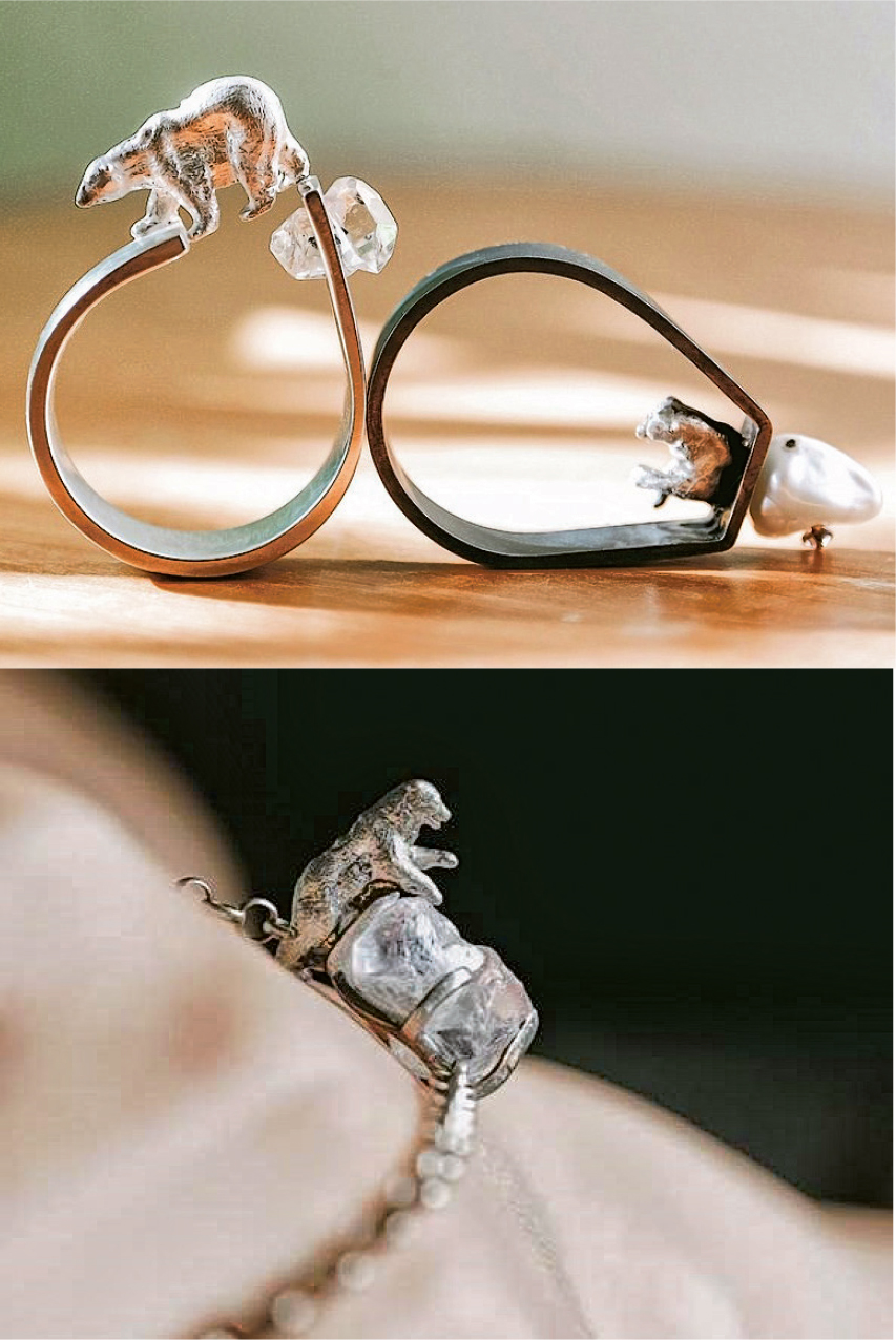 由Janus Ng主理的5+2 by Jn於2018年創立,秉持「讓珠寶說話」的理念,讓每件作品成為一種有聲的表達。面對日益嚴峻的氣候變遷,Janus創作出極具意義的Homeless系列。其中一款手鏈以精細雕刻呈現一隻瘦弱的北極熊,在破碎的浮冰上喘息,象徵牠在暖化世界中艱難求生,提醒大眾關注極地生態、守護地球未來。●