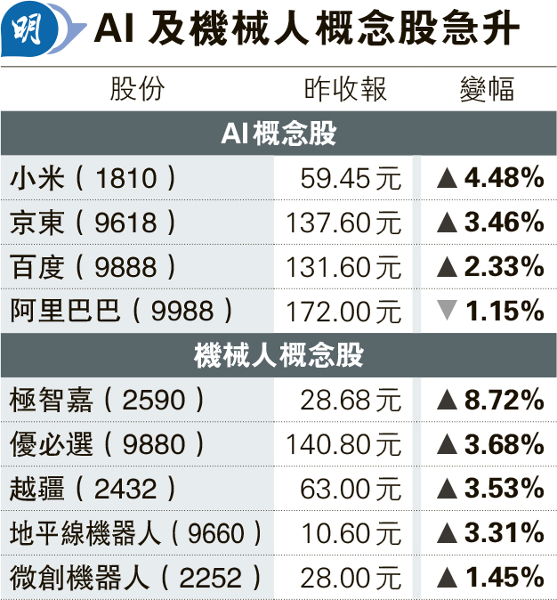 大舉進軍AI消息刺激下,京東昨勁升最多7%,高見142.6元,見3個月高,收市仍升逾3%。同時AI概念全面上揚,其中百度(9888)收升4%,小米(1810)發布新旗艦手機17前偷步勁升4%、收市仍升逾4%(見表)。不過率先表態加碼AI投資的阿里巴巴(9988)周三(24日)急漲後昨先升後回,收跌逾1%。此外機械人板塊受捧,以極智嘉(2590)收升逾8%一馬當先,優必選(9880)、越疆(2432)亦升3%。寧德時代(3750)A、H股同創新高,H股收市升逾半成,報532元。
