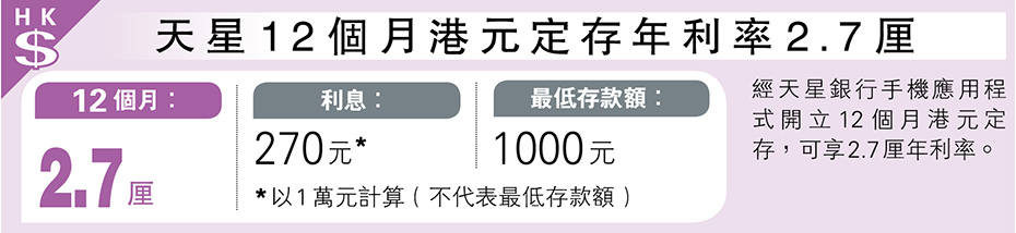 經濟 天星12個月港元定存年利率2.7厘 發佈於 2 個月 前 2025 年 9 月 30 日 By 明報 【明報專訊】經天星銀行手機應用程式開立12個月港元定存,可享2.7厘年利率。(圖) 日報新聞-相關報道: 南商3個月美元定存年利率4厘 (2025-09-30) 相關文章:南商3個月美元定存年利率4厘 (2025-09-30) Up Next 張兆聰:阿里健康有條件炒落後 不要錯過 美黃金儲備總值突破1萬億美元 超帳面逾90倍 繼續閱讀 贊助商 猜你喜歡