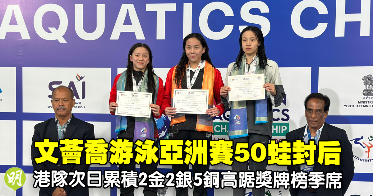 中國香港代表隊昨(29日)在印度舉行的第11屆長池游泳亞洲賽再取佳績,其中16歲新星文薈喬於女子50米蛙泳決賽游出32.04秒,與緊隨其後的隊友張穎怡包辦金、銀牌之餘,其後她在伙拍3名隊友在女子4×200米自由泳接力決賽摘銀;連同李芯瑤在女子50米自由泳及王子依在女子1米板各添一面銅牌,港隊在第2個比賽日斬獲1金2銀2銅。
