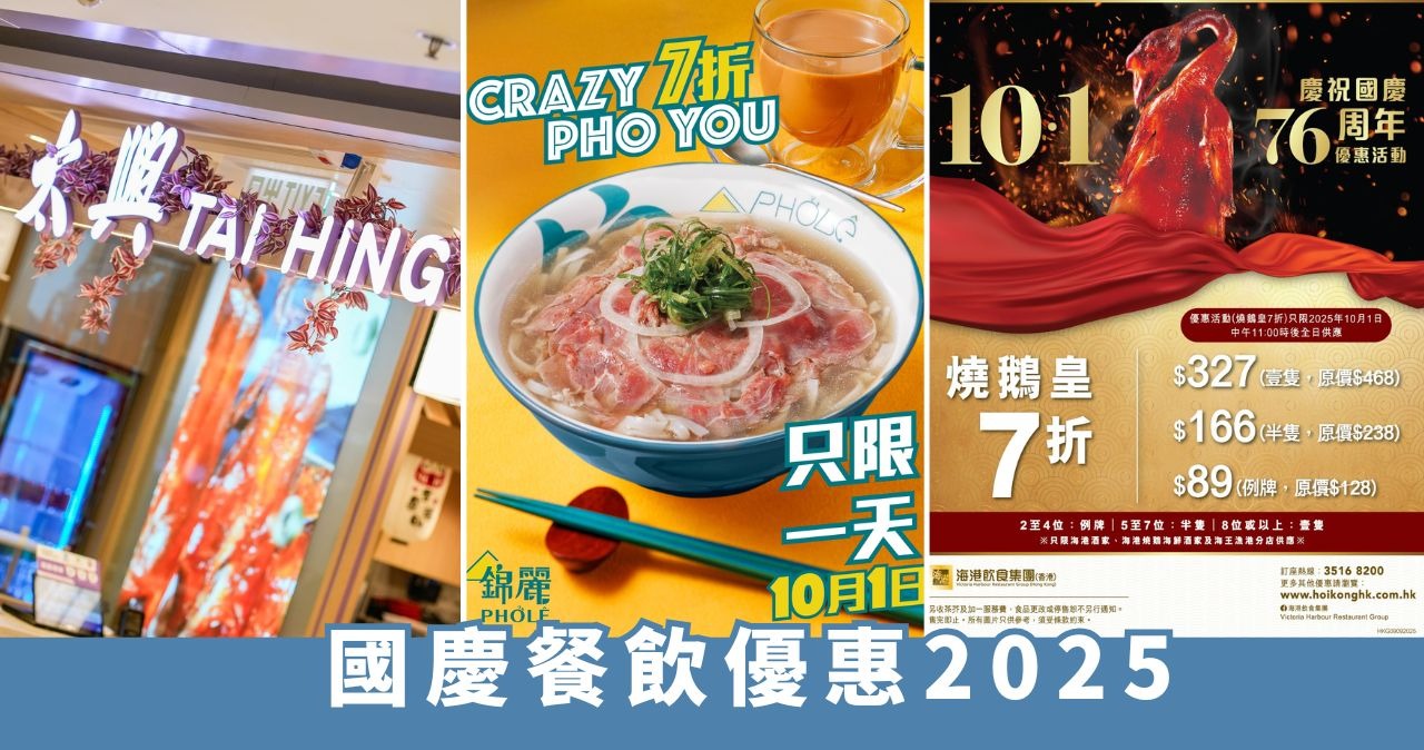 為慶祝10月1日國慶76周年,全港超過3000間食肆及不同商場推出餐飲及消費折扣優惠,本文精選部分優惠。食肆優惠詳情可按此。