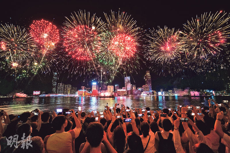 【明報專訊】為慶祝中華人民共和國成立76周年,昨晚8時維港上空舉行23分鐘的國慶煙花匯演。酷熱天氣下維港兩旁聚集大批市民及遊客,其間紛紛舉機拍照,有市民表示期待第四幕的大熊貓頭像圖案(圖2),結果「耳朵塌了下去,不太像」,與期望有落差。警方稱昨晚有34.4萬人在維港兩岸賞煙花,較估計29萬人多。