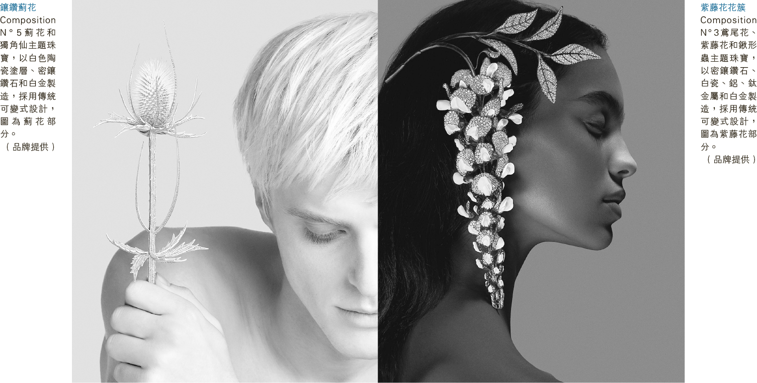 Composition N°3的主角包括鳶尾花和紫藤花,以白金鑲嵌的鑽石在鳶尾花花瓣勾勒出優美白線,小巧花蕊以黑色DLC塗層鈦金屬製造,葉片上更鑲嵌兩行粒鑲鑽石和兩顆水滴形白水晶,塑造晶瑩露珠的詩意畫面。紫藤花花簇則由約100個人手組裝的獨立組件組成,重現紫藤花自然垂落的飄然美態。為了在Composition N°2中重現玉蘭花的形態,工匠先掃描真正的玉蘭樹,包括枝椏、花朵和花蕾,以雪花鑲嵌技巧將鑽石鑲嵌於鋁金屬上;白金花心內的鑽石則採用反向鑲嵌,鑽石尖底朝外,帶來意想不到的閃爍效果。來到最後的Composition N°1,Claire刻意令光線在以罌粟花、豌豆花、蝴蝶為主角的珠寶中徹底消失。罌粟花朵的啞黑色鈦金屬花瓣內側先添上人手蝕刻的脈絡,再塗上Vantablack塗層,能吸收99.965%的光線,令物質猶如消融於虛無之中。在近乎全黑無光的設計中,一隻蝴蝶如幽靈般飛舞,透明黑色玻璃蝶翅亦呈現拋光紋理,與啞光表面形成強烈對比。6套珠寶逐漸由極光漸變至極黑,呼應萬物終會消逝的侘寂主題。●