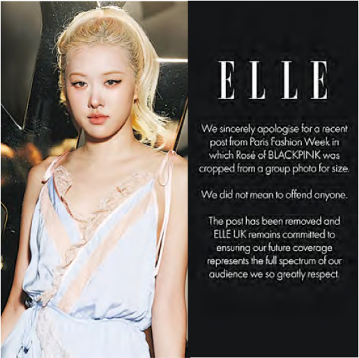【明報專訊】韓國女團Blackpink成員Rose日前以YSL代言人身分出席巴黎時裝周活動,跟英國女歌手Charli XCX、加拿大樂壇天王Justin Bieber的名模妻子Hailey Bieber及《蝙蝠俠》素兒卡維斯(Zoe Kravitz)並肩坐VIP首排位置,讓傳媒拍照。時尚雜誌《ELLE》英國版透過社交媒體上載素兒3人合照,把站在旁邊的Rose裁走,照片曝光後惹起粉絲不滿,批評此舉有種族歧視之嫌。事件連日發酵,雜誌前日補貼Rose單人照片,仍未能平息眾怒,昨日終發文道歉:「我們為Rose照片遭裁切一事衷心致歉,絕對沒有冒犯任何人的意圖,有關照片已經刪除。」