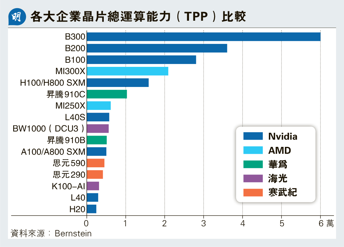 若以目前數據看,華為及一眾中資晶片廠的產品能力,似乎仍與Nvidia有不小距離。據股市研究公司Bernstein資料,以總運算能力(TPP)計,Nvidia產品能力仍問鼎全球,由旗下B100、B200、B300三兄弟壟斷頭三名。華為最強的產品910C只能屈居第六,總運算能力與Nvidia的王牌產品B300相差近5倍,與第四位AMD的AI300X亦差1倍。Bernstein估計,今年中國AI加速器市佔率仍由Nvidia主導,佔54.4%;其次華為佔27.9%,約為Nvidia一半。其餘AMD、海光訊息(滬:688041)、寒武紀、阿里巴巴(9988)旗下的平頭哥半導體等各佔2.5%至3.9%。不過,黃仁勳多番點名華為,認為對方將急步追上Nvidia,從不敢小覷對方實力。黃仁勳今年7月訪問北京時向傳媒表示:「實際上,任何低估華為、低估中國製造能力的人,都是極其天真無知的,華為是一家非常強大的公司,我以前見過他們開發出的技術。」