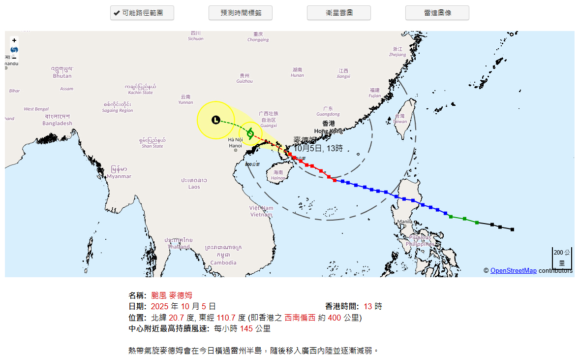 麥德姆今日會移向雷州半島。受其影響,華南沿岸風勢頗大,有狂風驟雨,海有大浪及湧浪。隨着麥德姆遠離及逐漸消散,中秋節廣東沿岸天色好轉。預料高空反氣旋會在本周中至後期為華南帶來大致晴朗及酷熱天氣,而一道廣闊低壓槽會在周末為南海中北部帶來幾陣驟雨。(天文台)