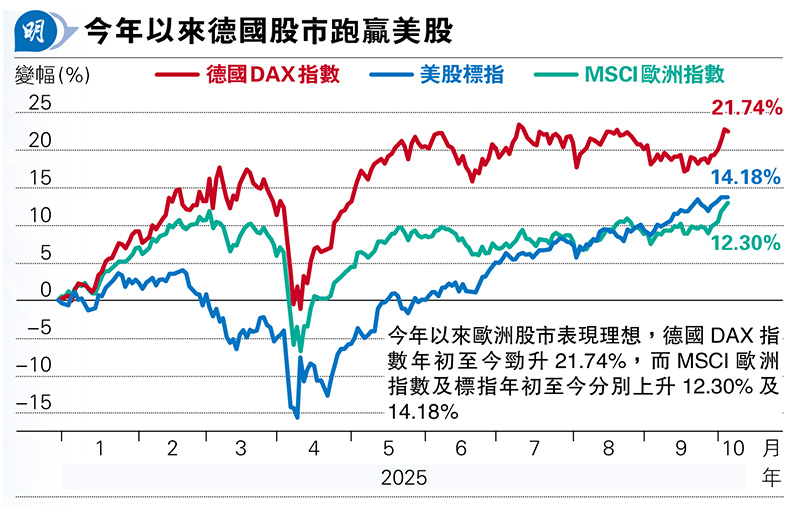 今年以來歐洲股市表現理想,德國DAX指數年初至今勁升21.74%,而MSCI歐洲指數今年首8個月跑贏美股標指後,上月開始才被後來居上,MSCI歐洲指數及標指年初至今分別上升12.30%及14.18%(見圖)。值得注意的是,考慮到歐元兌美元匯價年初至今上升約13%,故此假如以美元計價的話,其實德國DAX指數及MSCI歐洲指數分別跑贏美股標指逾20%及近11%。