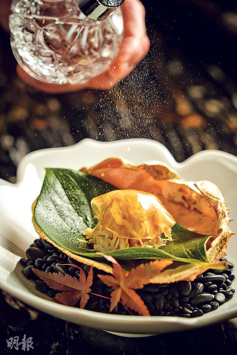 清蒸北海道毛蟹則注入茅台元素。將新鮮活毛蟹清蒸後拆肉,連蟹膏以蟹蓋盛載,再鋪上花超過3小時製作的龍蝦汁寒天啫喱。最令人驚喜的是,上菜時店員會在席前,將毛蟹用香水瓶噴上貴州茅台酒,不僅酒香撲鼻,更賦予儀式感,吸引大家舉機打卡拍片。