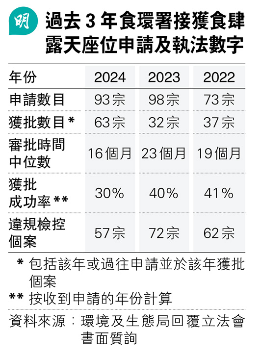 【明報專訊】《施政報告》提出加快審批食肆露天座位申請,環境及生態局長謝展寰昨回覆立法會書面質詢提到,食環署過去3年共接獲264宗食肆露天座位申請,有132宗獲批,成功率不足五成,而審批時間中位數則逾一年。有餐飲業界稱,現時食肆申請露天座位牌照需「過五關斬六將」,相信政府精簡審批程序及推出「會審」制度後,有助業界發展,「業界好期望盡快做到生意」。