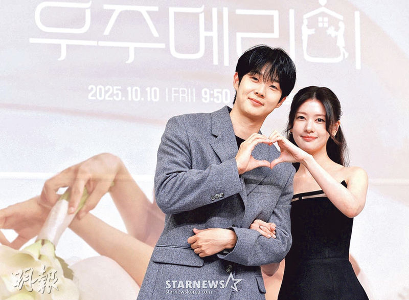 【明報專訊】《我們的浪漫電影》崔宇植與《媽媽朋友的兒子》鄭素敏合演韓國SBS電視台新劇《宇宙Marry Me?》昨晚首播,同日舉行記者會,他倆跟《鬼宮》申瑟琪、《你的味道》裴奈拏及《名校的階梯》徐范俊一同亮相;崔宇植大讚拍攝現場氣氛愉快又融洽,鄭素敏亦對拍檔讚不絕口,「我們經常即興發揮,導演亦任由我們『爆肚』,直至他喊Cut為止」。香港觀眾可以透過影視串流平台Disney+收看。