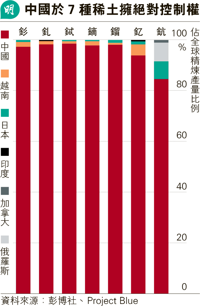 彭博指出,這是中國對稀土供應採取最針對的限制措施,將阻礙推動人工智能發展的晶片產業,因為荷蘭半導體設備生產商ASML、美國應用材料(Applied Materials)所銷售的生產設備,包含極精密的雷射、磁鐵等,尤其依賴稀土。消息人士表示ASML或因此需延遲數周出貨,集團正為業務中斷做準備,並游說荷蘭和美國尋求替代方案。中國目前在7項生產晶片及軍事設備必須的稀土,擁有近乎壟斷的市場佔有率(見圖),新措施等同令相關企業出口貨品須得中方許可。