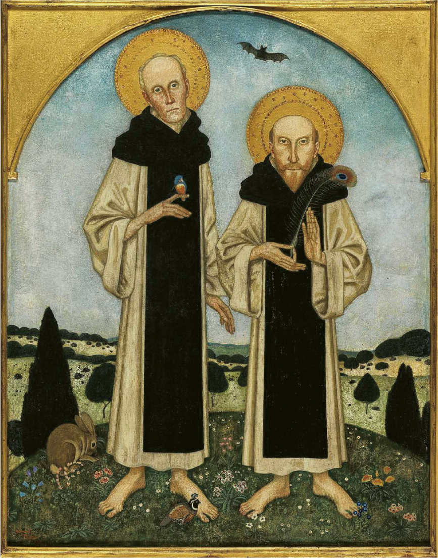 除了像格蘭特那樣將作品隱藏,亦有酷兒藝術家在創作中留下象徵暗號。「孔雀羽毛」便是其中之一,其華麗外觀本屬雄孔雀所有,挑戰了傳統對陽剛氣質的想像,因此成為非典型性別的象徵。插畫家艾德蒙‧杜拉克(Edmund Dulac,1882-1953)於1920年創作《查爾斯‧瑞基茲與查爾斯‧夏農的中世紀聖徒肖像》(Charles Ricketts and Charles Shannon as Medieval Saints),畫中夏農手持一根孔雀羽毛,暗藏象徵意涵。瑞基茲與夏農自青少年時期相識,在倫敦共同生活逾50年,並長期於藝術與出版領域合作。他們是英國藝術圈中備受尊敬,卻因時代限制而無法公開身分的酷兒伴侶之一。畫中細節為熟悉當時語境的觀者提供隱喻,象徵他們的親密關係與性別認同。
