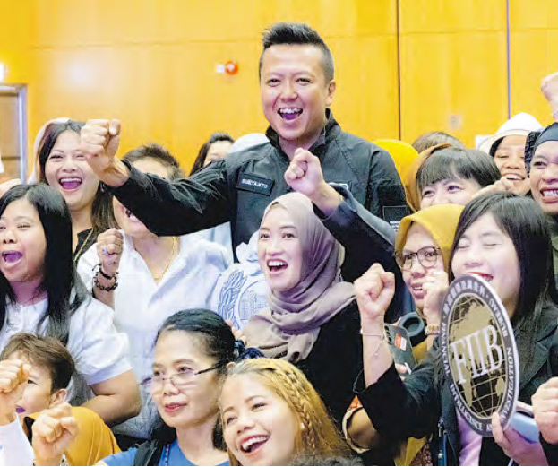 【明報專訊】喺上月中嘅鰂魚涌拆彈行動中,警方爆炸品處理課高級炸彈處理主任高級警司李展超「一戰成名」,身穿印有印尼文「Suryanto」英文名嘅工作服參與新聞發布會,「展超sir」引起印尼網民高度關注,印尼駐港總領事館噚日請咗展超sir,參加喺天水圍社區會堂舉辦嘅「非法墮胎法例×反洗黑錢×防騙」專題講座。外傭見到展超sir即一擁而上同佢打卡合照。