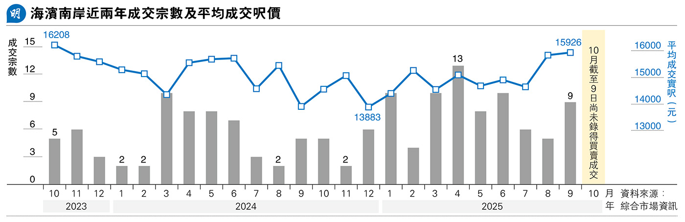中原副分區營業經理吳國豪指出,受低息環境帶動,近月投資者入市比例回升,部分租賃需求較高的屋苑的二手成交,亦見暢旺,惟受盤源減少影響,海濱南岸10月首9天,仍未錄得二手買賣成交,料第四季交投或會回落。