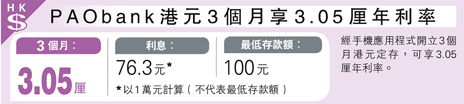 經濟 PAObank港元3個月享3.05厘年利率 發佈於 2 天 前 2025 年 10 月 14 日 By 明報 【明報專訊】經手機應用程式開立3個月港元定存,可享3.05厘年利率。(圖) 日報新聞-相關報道: 南商美元半年定存年息3.85厘 (2025-10-14) 相關文章:南商美元半年定存年息3.85厘 (2025-10-14) 不要錯過 海濱南岸平均呎價逼1.6萬 繼續閱讀 贊助商 猜你喜歡