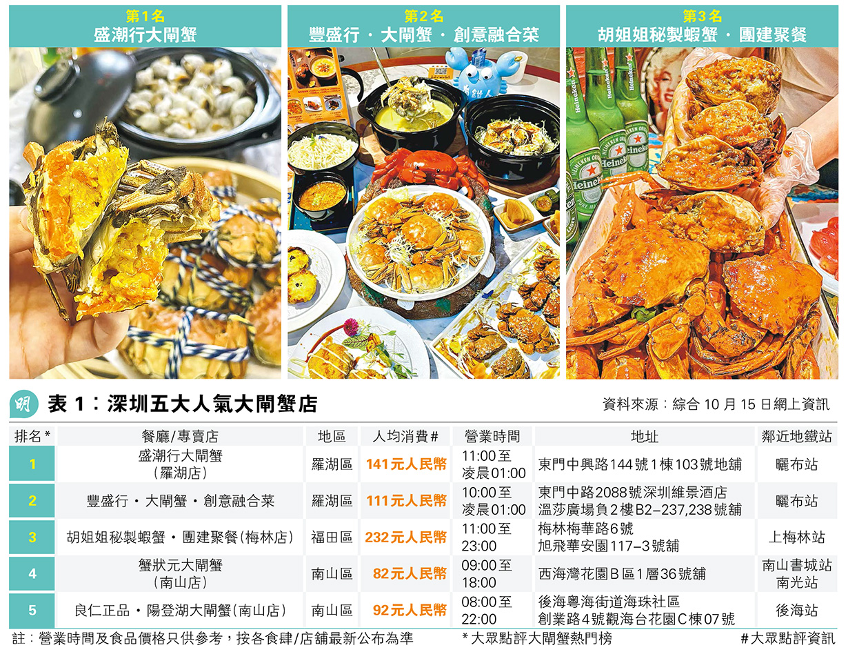 若想即買即食,目前不少內地超市如盒馬鮮生、七鮮京東及大閘蟹專門店,也有提供即買即蒸的服務。盛潮行大閘蟹是其中一家深圳人氣大閘蟹店,佔據大眾點評大閘蟹熱門榜首位(見表1),大閘蟹售價可低至199元人民幣10隻,該店也可提供即買即蒸服務,購買6隻起可送深圳各口岸,購買10隻以上全深圳包運費,該店亦設堂食,除清蒸大閘蟹,更提供蟹黃麵及蟹粥等菜式選擇。