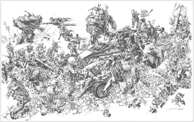 19件展品中包括8幅藝術印刷品、1幅特製繪畫作品、3幅自畫像和7件跨媒體作品。金政基擅長以即席速畫的筆觸,題材圍繞音樂、漫畫、港韓文化傳說等。展品中包括了上次展覽未亮相的作品,例如在2016巴黎漫畫博覽會中現場繪畫,以蝙蝠俠為主題的Batman, 2018(可訂購印刷版$38,000);Adidas×Kasina×Kim Jung Gi – The Monster的聯乘波鞋,以黃、白、黑為主調,飾以奪目的老虎插畫,融合藝術與街頭時尚。場中還有由Unbox與Coolabo Official合作,將金政基手繪作品轉化為雕塑的Noonbool TOKKI。