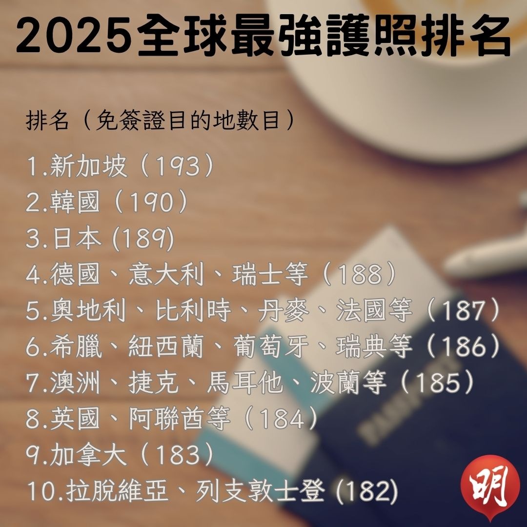 2025年10大最強護照排名【查詢排名按此】