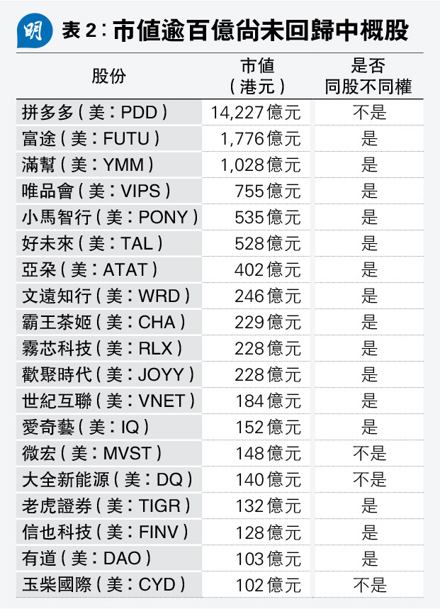 WVR與中概股回歸兩個議題互有牽連,據本報統計,現時市值逾100億元或以上、尚未回港上市的中概股至少有19隻,當中大部分屬WVR公司(表2)。而現時《上市規則》WVR公司市值至少需要400億元。若最近財年收入達10億元以上,市值要求才可減至100億元。