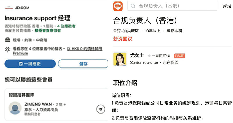 京東港招聘保險人員 消息:正申牌照 內地早佈局金融保險 保監局:不評論個別牌照情况