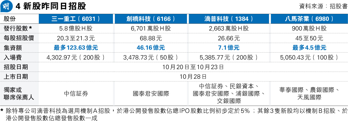 【明報專訊】新股於本年度最後一季繼續衝刺,4隻新股昨日至本周四(23日)招股(見表)、合共最多籌181億元。當中以內地工程機械製造龍頭企業三一重工(6031)(滬:600031),為今輪新股中集資額最大,該股選用不設回撥的機制B招股,於全球發售5.8億股H股、最多籌約124億元,初步議定一成股份為於港發售,招股價為20.3至21.3元,1手200股計,入場費約4303元,中信証券為獨家保薦人。以招股價中位數計,三一重工招股價較昨日A股收市價22.49元人民幣,折讓15%。