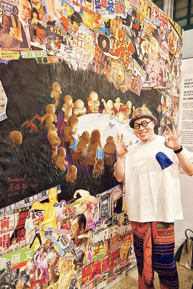 【明報專訊】60歲詹瑞文首度進軍繪畫領域,與藝術家、「光頭仔」創作者梁賀(Lego)聯袂創作大型混合媒介畫作《光頭仔與四眼詹的盛宴》,開價88萬港元,成為《新藝潮十週年:ArtNext Fair 2025》展覽焦點。詹瑞文好友黃浩然、葉子楣、陳欣健、李蕙敏和樂易玲等現身參觀。