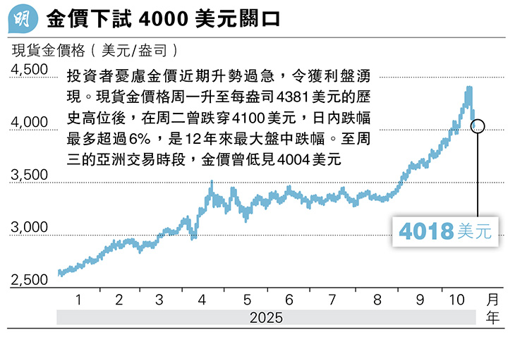 【明報專訊】投資者憂慮金價近期升勢過猛,紛紛獲利了結。現貨金價周一升至每盎司4381美元的歷史高位後,周二曾跌穿4100美元,跌幅最多超過6%,是12年來最大盤中跌幅。至周三的亞洲交易時段曾跌至逼近4000美元關口,低見4004美元。期金昨亦在4000美元水平徘徊,是接近兩周低位。從技術分析,金價受到21天移動平均線(4005美元)所支持。