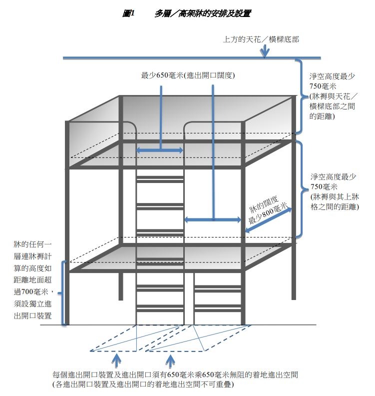 政府更新《牀位寓所牌照申請指引》,最新列明每張牀位闊度至少須800毫米,高架牀需設開口,總長度不能少於牀位長度。指引亦訂明用於居住的房間,由樓面量度至天花板的高度須不少於2.5米,而至任何橫樑的底面的高度須不少於2.3米。