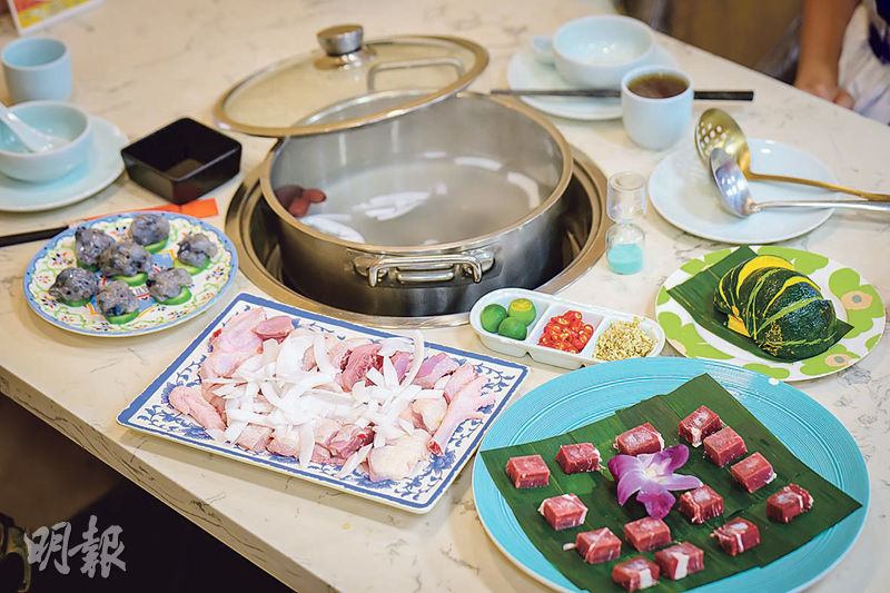 【明報專訊】秀色野菌椰子雞現有兩家分店,蛇口海上世界店裝潢較大眾化,以食材選擇多取勝。餐牌花多眼亂,除了常見肉類,還有三色蔬菜麵、紅薯粉、玉米、娃娃菜、茼蒿、芝士年糕等選擇,涼食則有皮蛋、麻辣烏雞爪、海蜇等,像打邊爐店般配料豐富。