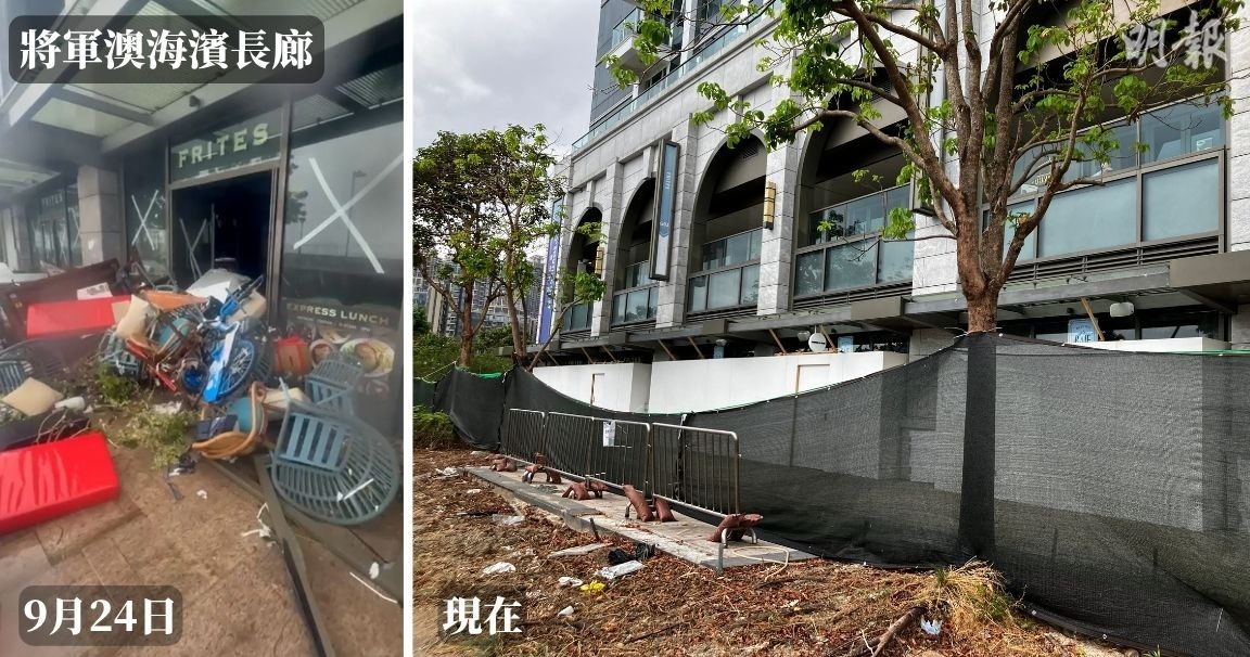 另一重災區將軍澳海濱長廊,臨海5間商舖仍然被圍封要停業,包括4間餐廳及1間健身室。海濱行人路多段欄杆被越堤浪沖毁,部分已修好,但仍有工人在焊接其餘欄杆,曾被海水淹浸的單車徑現已開放使用。發展局早前稱,會在單車徑花槽位置多建一道1米高的擋水牆,冀明年完工。