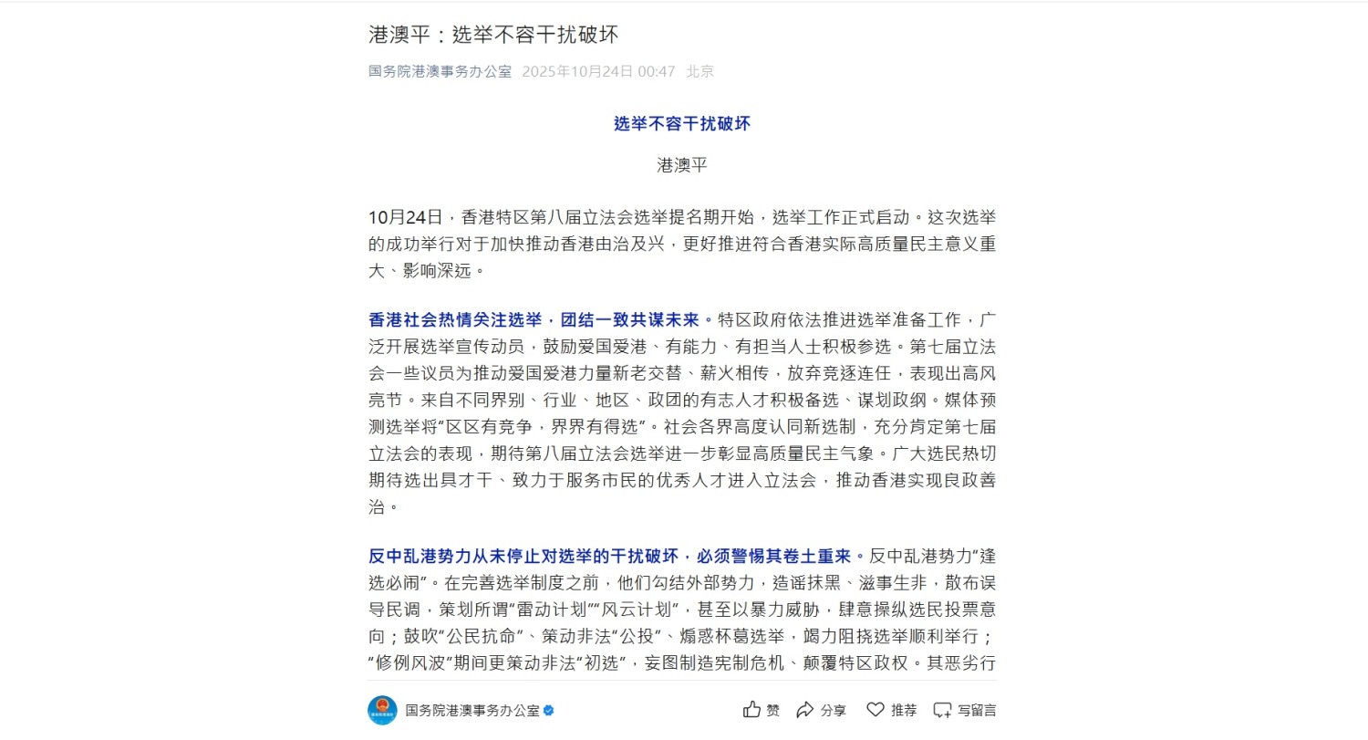 立法會選舉提名期今(24日)展開,港澳辦凌晨發表署名「港澳平」的文章,題為「選舉不容干擾破壞」,提到今屆立法會一些議員為推動愛國愛港力量新老交替、薪火相傳,放棄競逐連任,「表現出高風亮節」,稱社會各界期待立法選舉「進一步彰顯高質量民主氣象」。