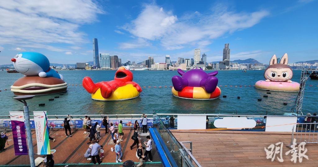 多啦A夢、KAWS & 芝麻街、滑嘟嘟和Labubu 4個巨型充氣雕塑,即日(25日)起一連8日在金鐘添馬公園對開海域展出,毗鄰的海濱長廊同時舉行巡遊市集,場內設多個不同IP打卡位,包括Snoopy經典《花生漫畫》家族、黃鴨及多啦A夢。明報電子平台組以影片帶讀者率先看。(拍攝及剪接︰卓朗為)