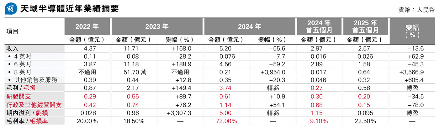 【明報專訊】近月先後有兩家全球主要碳化矽外延片製造商向港交所遞表申請來港掛牌,包括廣東天域半導體(下簡稱:天域)及廈門瀚天天成,而率先於7月遞表的天域首先通過上市聆訊,或短期展開招股。集團貴為全球第三大、中國最大碳化矽外延片製造商,近年盈收表現卻相當波動,2023年盈利大增33倍,怎料翌年、即去年卻轉虧5億元(人民幣,下同),主因仍是其主打6吋碳化矽外延片價格下滑,而8吋碳化矽外延片尚待發展,但至少今年首5個月已回復盈利,「盛惠」952萬元。