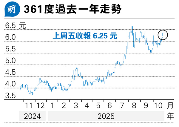 近日361度公布的零售數據算對辦,2025年第三季度,集團主品牌產品零售額(以零售價值計算)按年升約10%;361度童裝品牌產品的零售額(以零售價值計算),按年亦升約10%;361度電子商務平台產品整體流水,按年升約20%。然而,過去3個月,361度股價升至6.3至6.4元每每遇阻力,而在5.5元則現承接,因此不妨於5.5至6.4元區間炒波幅。