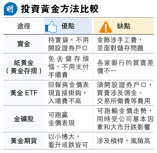 新加坡銀行報告則指出,金價近期升勢可能有些過猛,惟發達國家財政可持續性成疑,加上美聯儲獨立性可能受到干預,這些擔憂預計將持續至2026年,難料金價是否已經見頂。該行將12個月的金價預測,上調至每盎司4600美元。若然認同金價長線升勢未變,不妨加入個人退休投資組合中,可約佔3%至5%。至於投資黃金的方法有多種,包括買入實金、紙黃金(黃金存摺)、黃金ETF、金礦股及黃金期貨等,而每種方法各有優點和缺點,涉及的風險不盡相同,因此應視乎個人的風險承受能力去選擇。