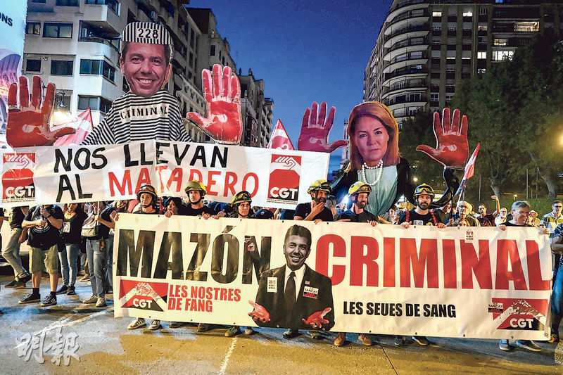 【明報專訊】西班牙東部巴倫西亞(Valencia)自治區的半世紀最致命洪災即將一周年之際,當地上周六(25日)舉行遊行示威,約有5萬人參與。示威者譴責當局缺乏應對災難能力,要求問責,令自治區主席馬松(Carlos Mazon)落台壓力大增。抗議活動由社會、公民和勞工團體發起,遊行至巴倫西亞自治區政府總部結束。按西班牙中央分權制度,應對災害是地方政府負責。去年10月29日起連日暴雨引發洪水,惟自治區政府在洪水發生後逾12個小時才向民眾手機發出洪水警報,結果巴倫西亞省和阿爾瓦塞特省等地廣泛水浸,229名死者過半年逾70。