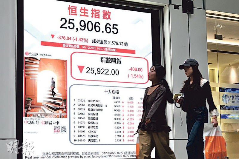 港股昨日全日成交額降至2576.12億元,較周四成交額大減961.92億元。10月份計,恒指跌3.53%,表現為亞洲主要股市中最差。同期,A股滬深300指數大致無升跌、上證綜指升1.85%,日、韓股指分別大升逾16%及20%再創新高,台股亦累升逾5%。