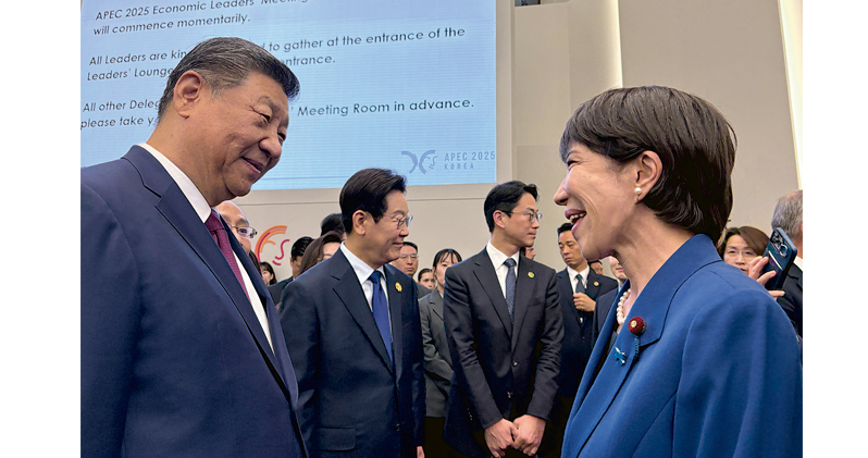 【明報專訊】國家主席習近平昨(31日)在韓國會晤日本首相高市早苗時指出,希望日本新內閣樹立正確對華認知,恪守和履行中日4個政治文件就歷史、台灣等重大原則問題作出的明確規定,同時深化拓展交流以改善國民感情,並妥善管控分歧,避免讓矛盾分歧定義兩國關係。高市早苗就海洋主權、稀土管制等多個日方關注的議題表達關切,亦要求中方積極應對恢復進口日本水產品和牛肉相關事宜。