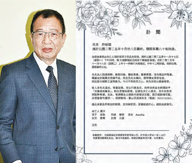 【明報專訊】資深演員許紹雄10月28日凌晨2時30分因癌症引發器官多重機能衰竭安詳離世,家人及很多好友陪伴送別,終年76歲。昨公布喪禮安排,由未亡人鳳子領兒子俊貽、兒媳樂琳、孫女Aurelia、女兒惠菁及女婿元晏,於11月17日下午4時在大圍寶福紀念館設靈,翌日大殮儀式後出殯,靈柩奉移火化,「家人承先夫遺志,喪事從簡,並以行善為念,將所收帛金全數捐助予『兒童癌病基金』,盼化悲慟為關懷,延續先夫仁心慈念,為年幼生命燃點新希望。在此,敬請親友以捐款代替贈送花籃。」