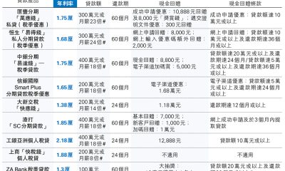 是次比較的稅貸中,東亞稅季貸款的實際年利率可低至1厘,螞蟻銀行(香港)分期貸款(稅季優惠)的實際年利率更可低至0.68厘(見表1),惟要留意要獲得此實際年利率,借貸額往往要逾100萬元。如上述的東亞稅季貸款的1厘實際年利率,便是以貸款額400萬元,每月平息0.045厘及還款期12個月計算。