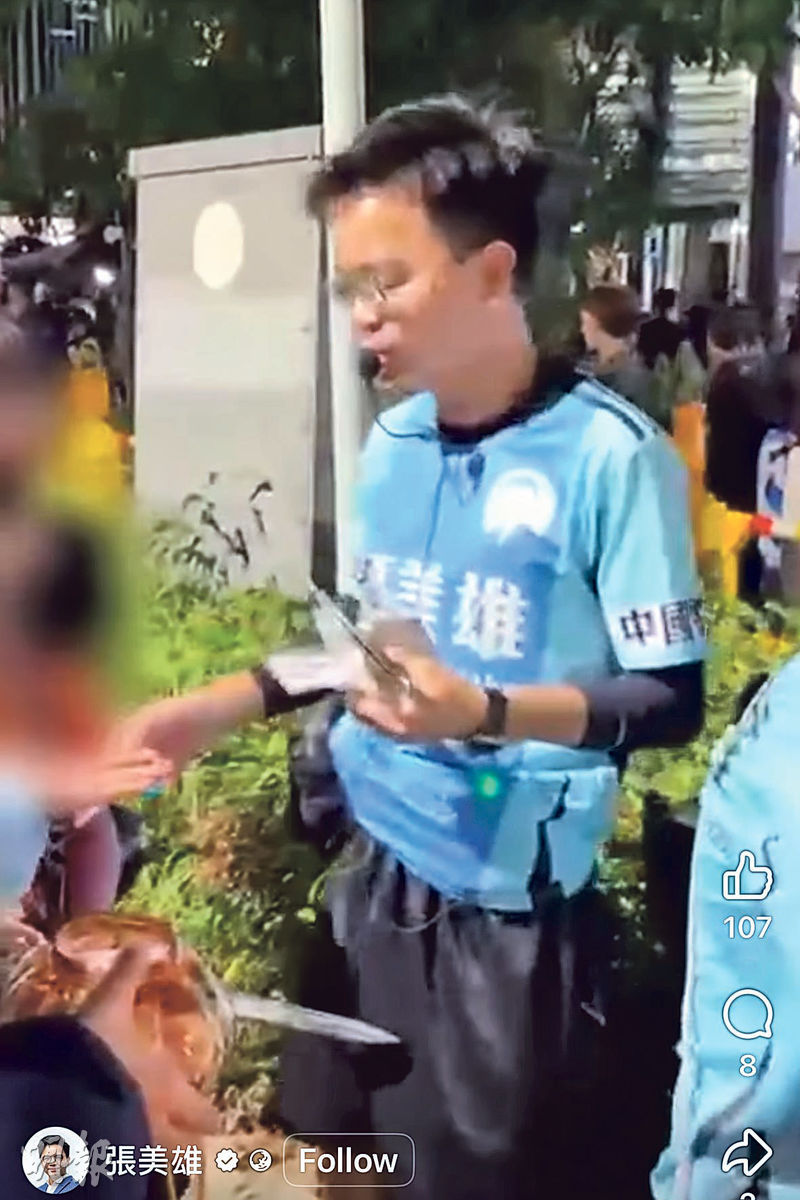 張美雄日前在社交媒體發布影片,片中可見他與助手身穿競選背心,向街頭的小朋友及家長派發貼紙等,並帶動小朋友高呼自己名字,帖文配字「琴晚Halloween 果然小朋友係最配合的」、「如果18歲以下有得投票,我應該穩贏」,隨後刪去後句。張回覆稱不擔心帶來負面觀感,反問「其他參選人也派發月曆卡,是否也納入小禮物?按這個準則也是賄選?」他說派貼紙屬於與居民慶祝節日,而所派貼紙及小量手指燈單價僅約兩毫,比選舉單張、月曆卡等便宜,以上成本會計入選舉經費,認為無違例,「光明磊落」。