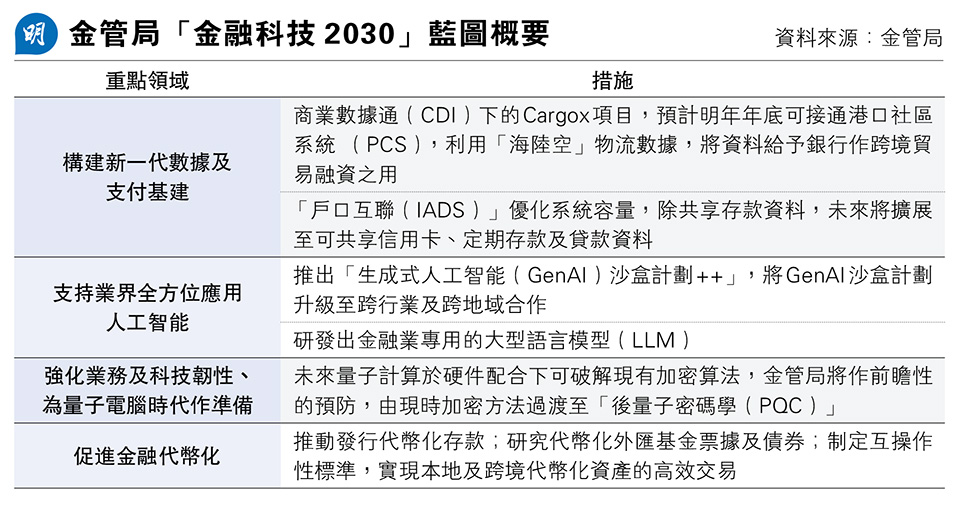 【明報專訊】金管局昨公布「金融科技2030」藍圖,聚焦四大重點領域,涵蓋逾40個具體項目(部分見表)。金管局總裁余偉文表示,「金融科技2030」的核心為數據(Data)、人工智能(AI)、代幣化(Tokenisation),以及韌性(Resilience),並統稱「DART」,目標於2030年將香港發展為更具深度、韌性及前瞻性的國際金融科技樞紐。另他預計央行數碼貨幣(CBDC)結算的代幣化貨幣市場基金,最快於今年內推出。